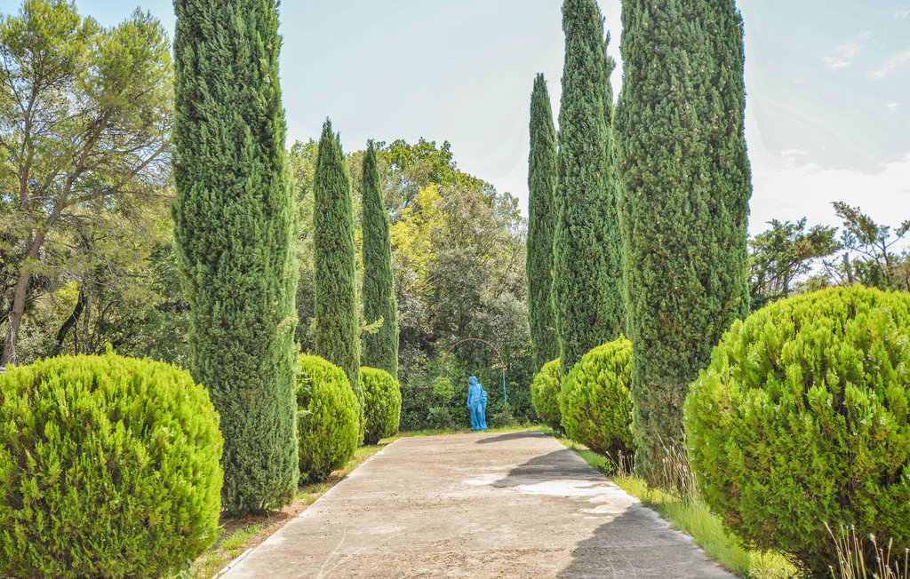 Cyprès élancés, arbres centenaires et lumière filtrée composent une atmosphère presque intemporelle.