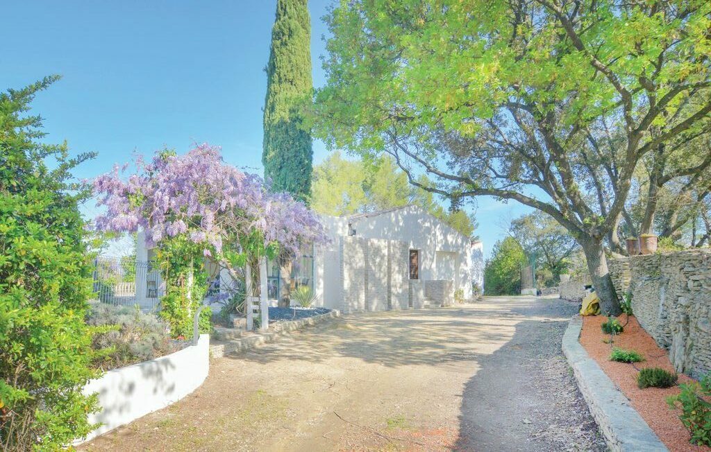 Face à la maison, la piscine s’étire sous le ciel du Sud.